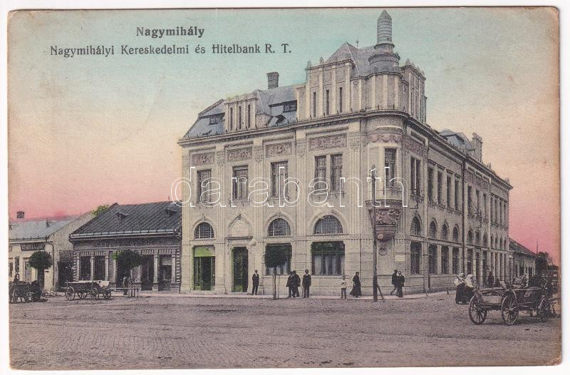 Leírás: Nagymihály, Michalovce; Kereskedelmi és Hitelbank rt., üzletek. Ifj. Grünfeld Mór kiadása / bank, shops (EK)