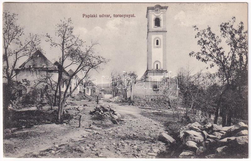 Rimakokova, Kokava nad Rimavicou; paplaki udvar és templom torony romjai az 1911. augusztus 3-i tűzvész után / ruins of the rectory and church tower after the 1911 fire (non PC) (lyukak / pinholes)