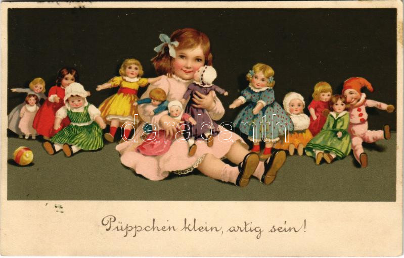 Leírás: 1914 Püppchein klein, artig sein! / Babák / Dolls. Meissner & Buch Künstler-Postkarten Serie 2000. Puppenmütterchen litho