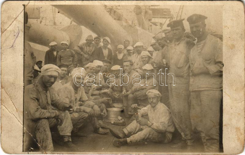 Leírás: K.u.K. Kriegsmarine SMS Viribus Unitis Osztrák-Magyar Haditengerészet Tegetthoff-osztályú dreadnought csatahajó matrózainak csoportképe a fedélzeten, szenelés közbeni pihenés / WWI Austro-Hungarian Navy, mariners on on the board of SMS Viribus Unitis. photo (Rb)