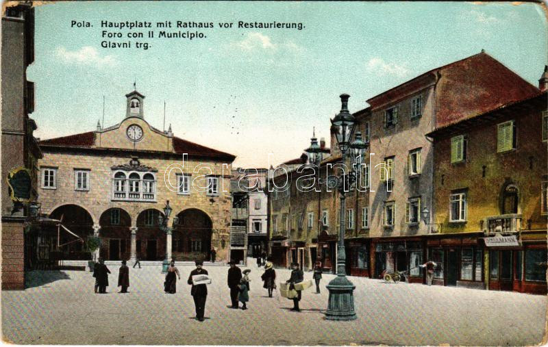 Leírás: Pola, Pula; Hauptplatz mit Rathaus vor Restaurierung. Foro con il Municipio. Glavni trg. / town hall before restoration, litho (worn corners)