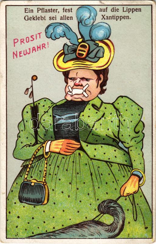 Prosit Neujahr! Ein Pflaster, fest auf die Lippen Geklebt sei allen Xantippen / New Year greeting marriage humour, wife with her mouth taped shut. litho (kopott sarkak / worn corners)