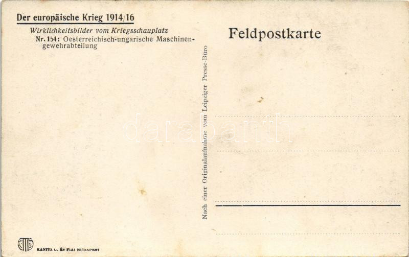 Der europäischer Krieg 1914/16. Wirklichkeitsbilder vom Kriegsschauplatz Nr. 154: Österreichisch-ungarische Maschinengewehrabteilung. Feldpostkarte / Osztrák-magyar katonák gépfegyverrel