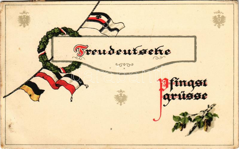Treudeutsche Pfingstgrüsse / WWI Austro-Hungarian K.u.K. and German military art postcard with Pentecost greetings and patriotic propaganda + "K.u.K. Werkkommando Lusern" (EK)