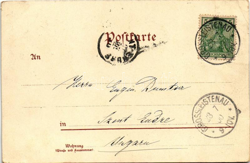 1900 Lisnowo, Groß Leistenau; Evgl. Kirche, Gasthaus z. Fürsten v. Bismarck, Schule, Johanna Hirschfelds Warenhaus / Lutheran church, school, hotel, inn, shop of Johanna Hirschfeld. Art Nouveau, floral, litho (cut)