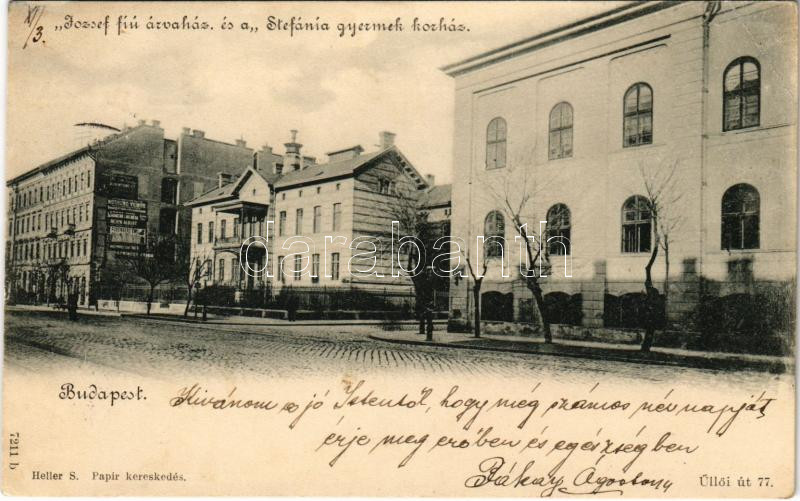 1901 Budapest VIII. József fiúárvaház, Stefánia gyermekkórház, Reich Albert, Rosenberg Emil, Grósz Mór, Nothling Vilmos, Springer Ármin üzleteinek hirdetése az egyik falon, Üllői út 72-74. Heller S. kiadása (EB)