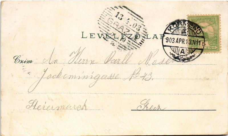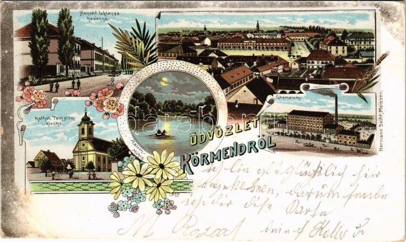Leírás: 1903 Körmend, Honvéd laktanya, katolikus templom, vízimalom, gőzmalom. Hermann Seibt Art Nouveau, floral, litho (EK)