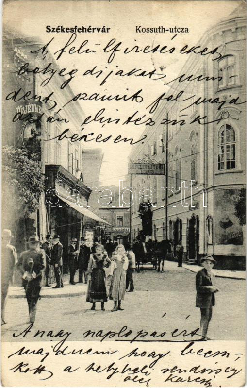 1906 Székesfehérvár, Kossuth utca, gyógyszertár, "Lefelé hajtani ... https://www.darabanth.com/hu/442-Gyorsarveres/442.0/Kepeslapok/Magyarorszag~2000005/1906-Szekesfehervar-Kossuth-utca-gyogyszertar-Lefele-hajtani-tilos-tabla-M-T-es-F-V~II2881225