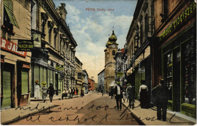 1913 Pécs, Király utca, gyógyszertár, üzletek (EK) https://www.darabanth.com/hu/442-Gyorsarveres/442.0/Kepeslapok/Magyarorszag~2000005/1913-Pecs-Kiraly-utca-gyogyszertar-uzletek-EK~II2906265