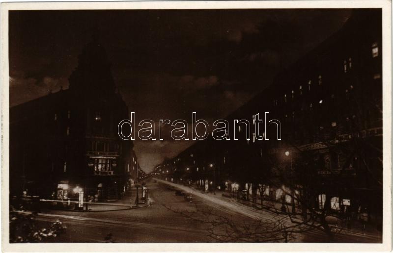Leírás: 1931 Budapest VI. Andrássy út eleje esti hangulatban, Nyírbogdányi petróleumgyár rt., üzletek