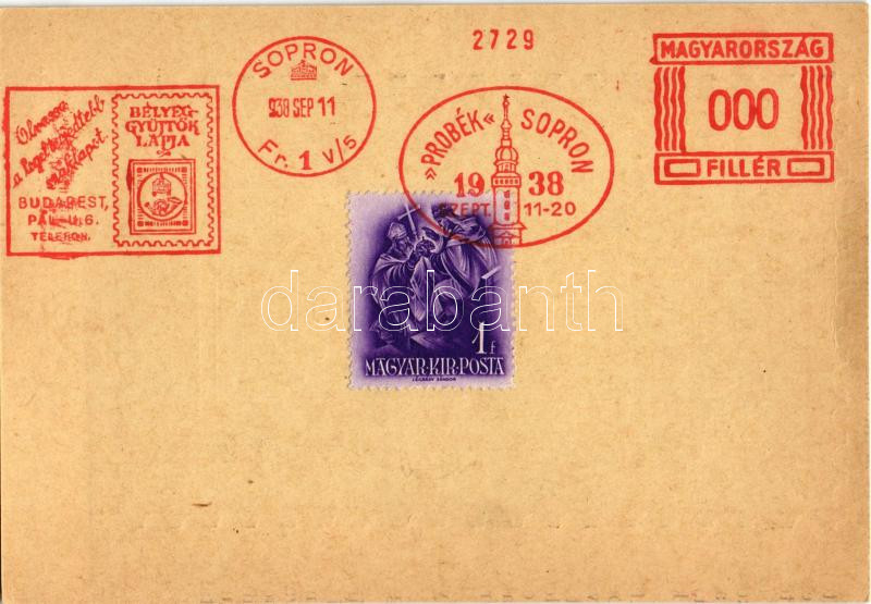 Leírás: 1938 Sopron, Bélyeggyűjtők Lapja Propaganda Bélyegkiállítása Sopron 1938. IX. 11-20. s: Fery + "PROBÉK Sopron 1938" So. Stpl. (non PC)