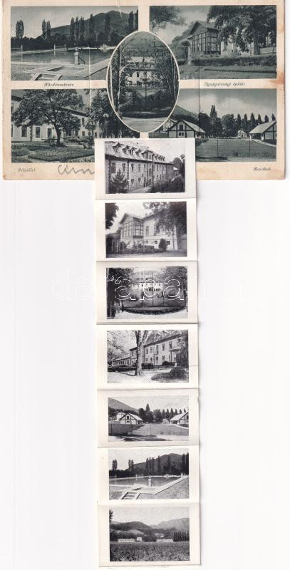 Leírás: 1942 Visegrád, Horthy Miklós telep, Fürdőmedence, Igazgatósági épület, Főépület, Barakkok. leporellólap 10 kis képpel (fl)