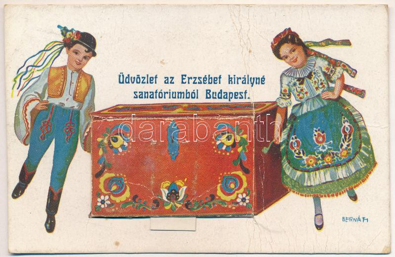 Leírás: 1943 Budakeszi, Erzsébet királyné szanatórium. Magyar népviseletes leporellólap 10 képpel s: Bernáth (fa)