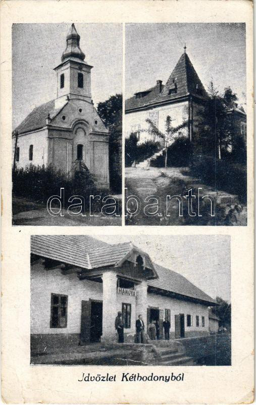Leírás: 1944 Kétbodony, templom, Hangya szövetkezet üzlete és saját kiadása (Rb)