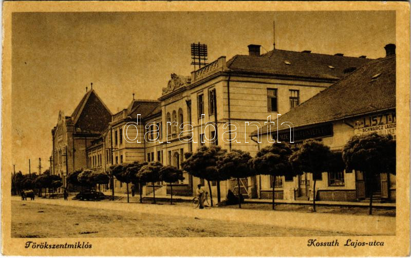 1950 Törökszentmiklós, Kossuth Lajos utca, Kir. Járásbíróság, automobil, kerékpár, Nemzeti Hitelintézet, Schwarcz László üzlete (ázott sarok / wet corner)