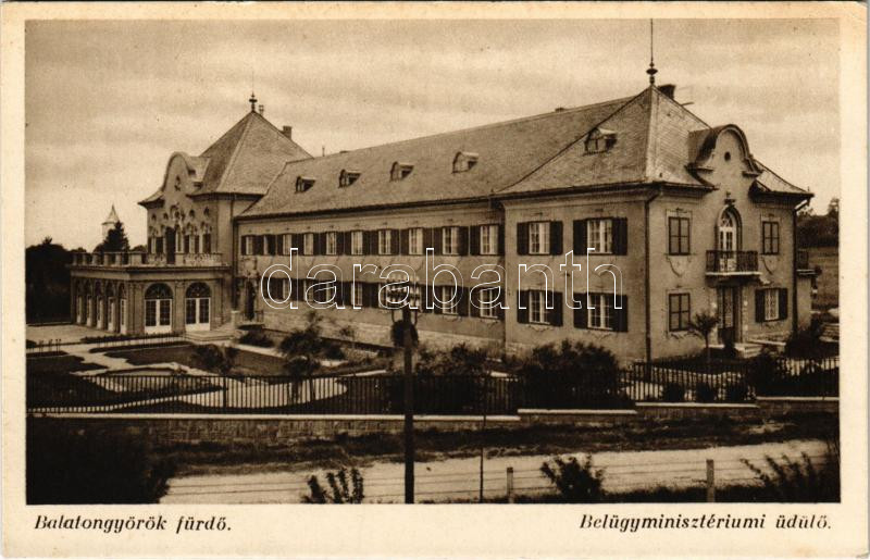 Balatongyörök, Belügyminisztériumi üdülő. Malek Károly kiadása https://www.darabanth.com/hu/442-Gyorsarveres/442.0/Kepeslapok/Magyarorszag~2000005/Balatongyorok-Belugyminiszteriumi-udulo-Malek-Karoly-kiadasa~II2911349