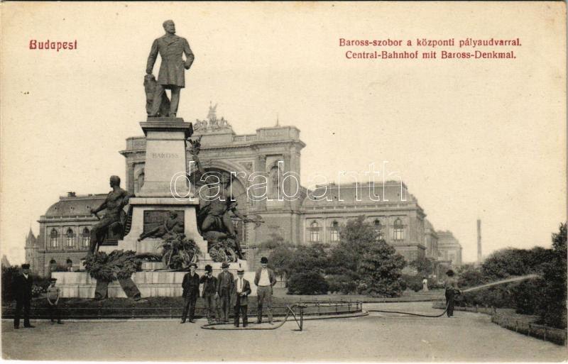 Leírás: Budapest VII. Baross szobor és központi (keleti) pályaudvar, növényeket locsoló férfi