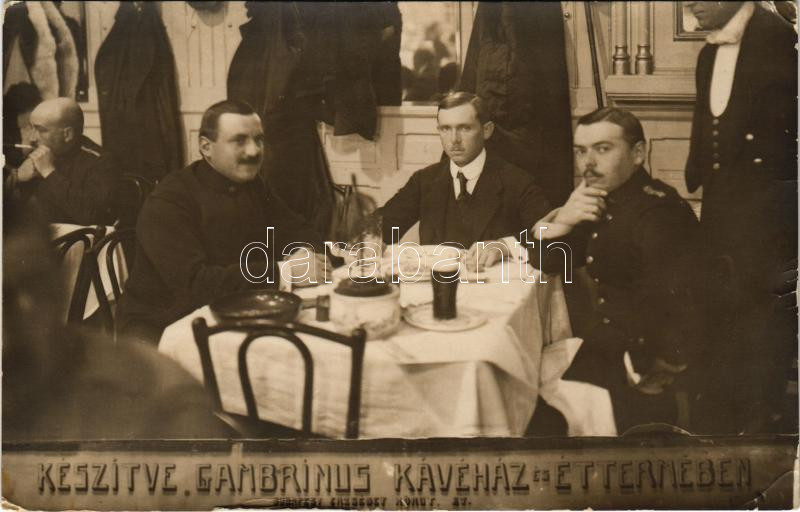 Budapest VII. Gambrinus kávéház és étterem, italozó társaság, pincér. ... https://www.darabanth.com/hu/442-Gyorsarveres/442.0/Kepeslapok/Magyarorszag~2000005/Budapest-VII-Gambrinus-kavehaz-es-etterem-italozo-tarsasag-pincer-Erzsebet-korut-37~II2911844