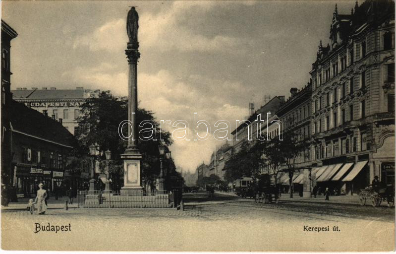 Leírás: Budapest VIII. Kerepesi út, Budapesti Napló szerkesztősége és kiadóhivatal (ma Rákóczi út 25.), villamos, Immaculata szobor