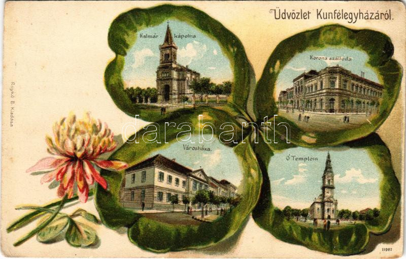 Kiskunfélegyháza, Kunfélegyháza; Kalmár kápolna, Korona szálloda, Városháza, Ó templom. Roykó B. kiadása, szecessziós dombornyomott litho montázs lóherével (EK)