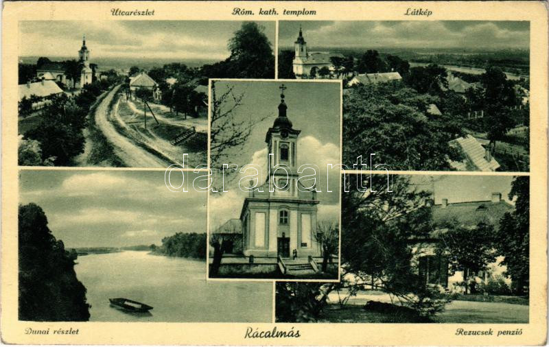 Leírás: Rácalmás, utca, Római katolikus templom, látkép, Dunai részlet, Rezucsek penzió (EK)