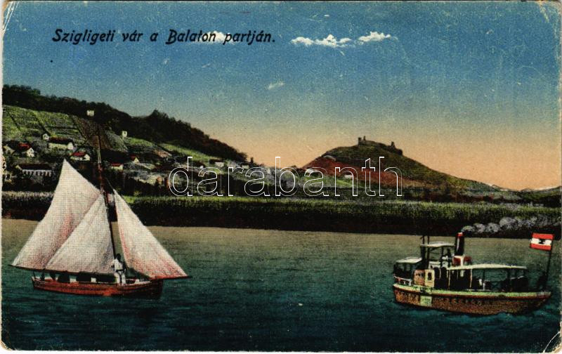 Szigliget, vár a Balaton partján, gőzhajó (EK) https://www.darabanth.com/hu/442-Gyorsarveres/442.0/Kepeslapok/Magyarorszag~2000005/Szigliget-var-a-Balaton-partjan-gozhajo-EK~II2906289