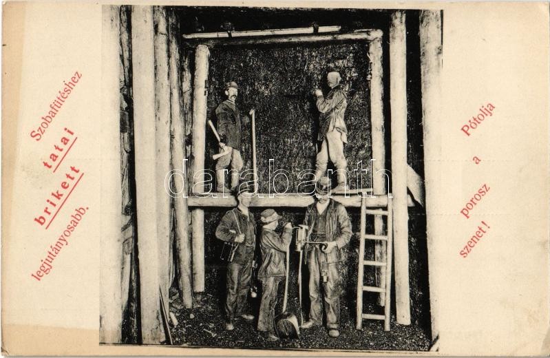Tatabánya, Brikettgyár reklámlapja, bányászok a bányában lámpással és létrával. "Szobafűtéshez a tatai brikett a legjutányosabb, pótolja a porosz szenet!" (EK)