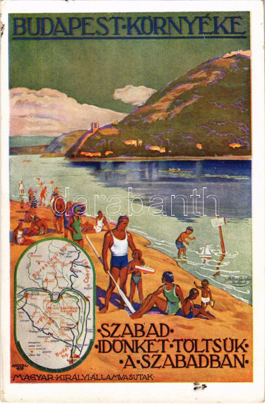 Visegrád és Nagymaros, Dunakanyar, Budapest környéke. A Magyar Királyi Államvasutak (MÁV) turisztikai reklám képeslapja, kiadja Klösz György és Fia / Hungarian State Railways tourism campaign advertisement s: Andor L. (fl)