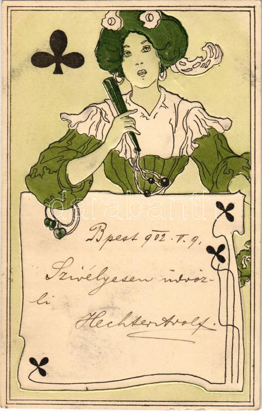 1902 Treff dáma (Francia kártya) / Queen of Clubs (French card). Art N... https://www.darabanth.com/hu/442-Gyorsarveres/442.0/Kepeslapok/Muveszlapok~2000090/1902-Treff-dama-Francia-kartya-Queen-of-Clubs-French-card-Art-Nouveau-Emb-BRW-409-EK~II2914513