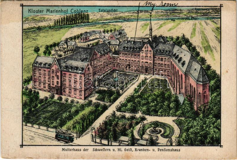1921 Koblenz, Coblenz; Kloster Marienhof Coblenz. Mutterhaus der Schwestern v. Hl. Geist, Kranken- u. Pensionshaus / monastery, hospital and boarding house, tram (EK)