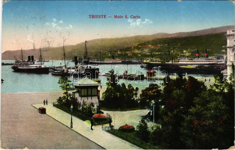 1917 Trieste, Trieszt; Molo S. Carlo / port, steamships (small tear) https://www.darabanth.com/hu/442-Gyorsarveres/442.0/Kepeslapok/Olaszorszag~2000054/1917-Trieste-Trieszt-Molo-S-Carlo-port-steamships-small-tear~II2877520