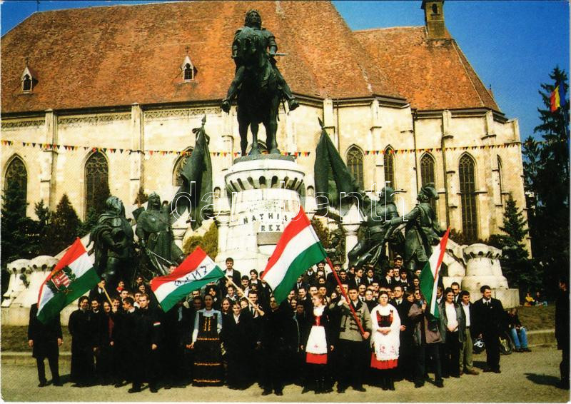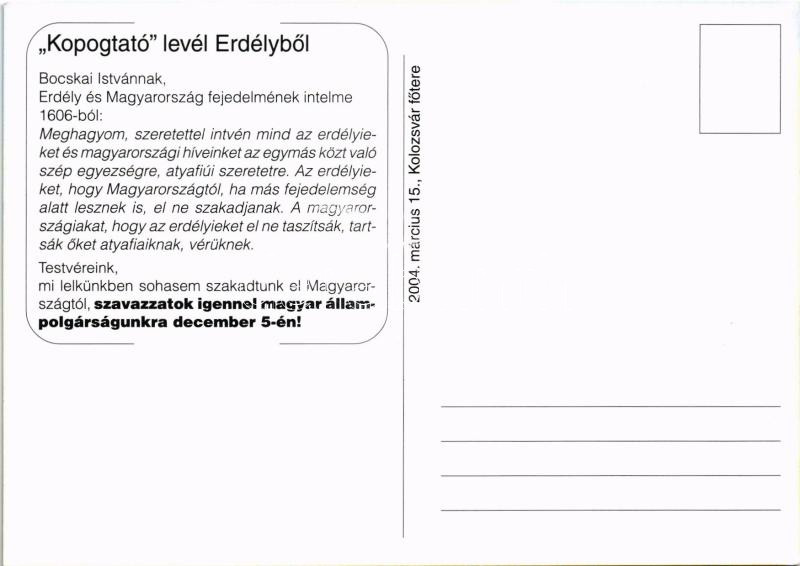 Leírás: 2004 Kopogtató levél Erdélyből. Kolozsvár főtere március 15-i ünnepségkor - Szavazzunk igennel magyar állampolgárságunkra december 5-én