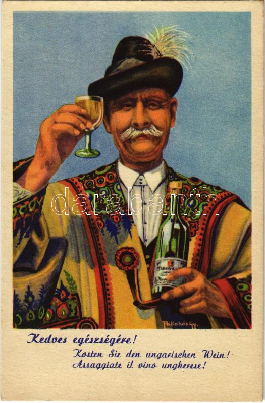 Leírás: Kedves egészségére! Magyar bor reklámlap, folklór / Hungarian wine advertising propaganda, folklore s: Pálinkás Gy.