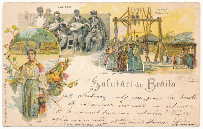 1899 (Vorläufer) Braila, Lautari, Leagan (Caroussel), Dansul Hora. Künzli Nr. 998. / Romanian folklore, folk dance and music. Art Nouveau, floral, litho (EK)