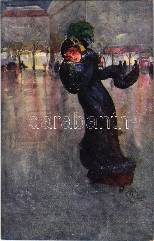 Leírás: Winter sport art postcard, ice skating lady. D.K. & Co. P. 665. s: K. Relink (EK)