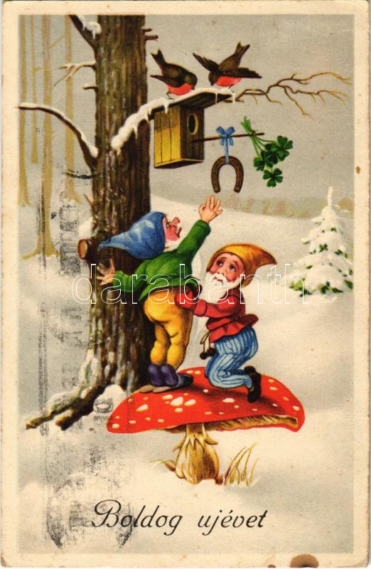 1947 Boldog Újévet / New Year greeting art postcard, dwarves with mush... https://www.darabanth.com/hu/442-Gyorsarveres/442.0/Kepeslapok/Udvozlolapok-Unnepek~2000101/1947-Boldog-Ujevet-New-Year-greeting-art-postcard-dwarves-with-mushroom-clovers-and-horseshoe-~II2913253