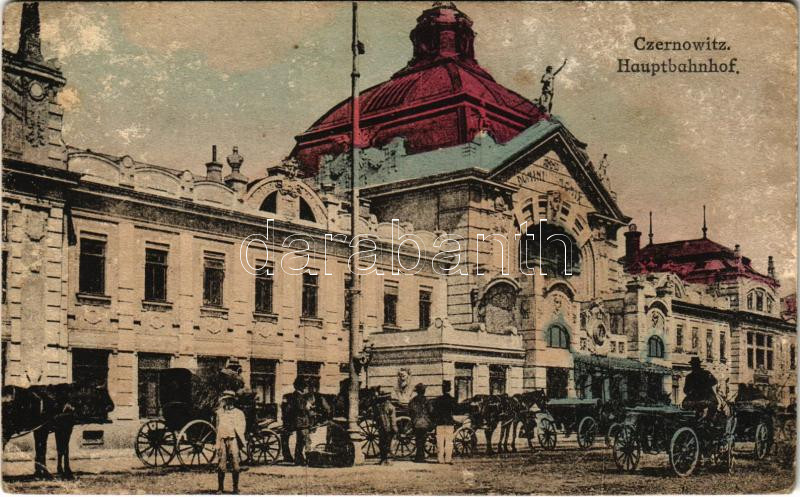 Leírás: Chernivtsi, Czernowitz, Cernauti, Csernyivci (Bukovina, Bukowina); Hauptbahnhof / railway station, horse-drawn carriages (surface damage)