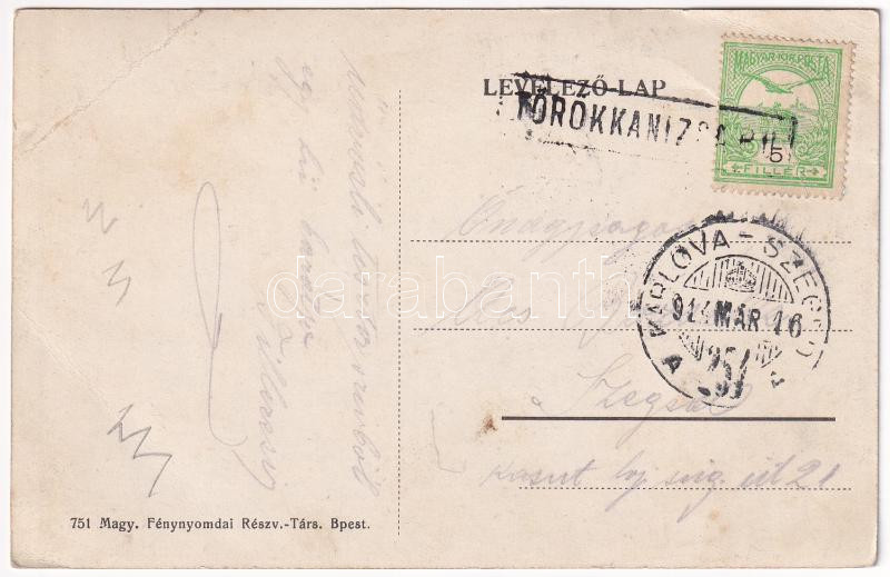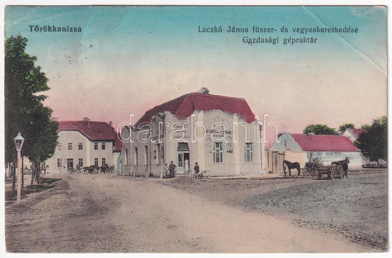 1914 Törökkanizsa, Nova Kanjiza, Novi Knezevac; Laczkó János fűszer- és vegyeskereskedése, gazdasági gépraktár, fűszer és vegyeskereskedés, dohány és szivar áruda, Szered és Zentai, Bruckner Testvérek üzlete / shops (EB) + "KARLOVA-SZEGED 254." vasúti mozgóposta