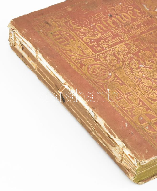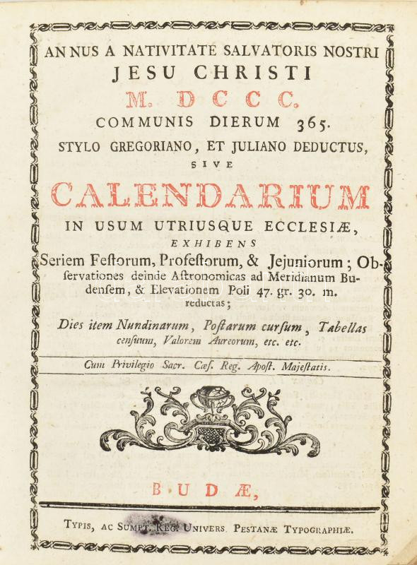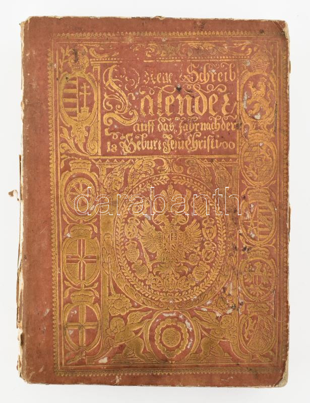 1800 Neuer Schrieb Calender Calendarium um in usum utrisque ecclesiae Buda, 1800. Univers Pestanae Typ. 436 h. +36 sztl lev. Dekoratív aranyozott osztrák és magyar címerrel díszített vaknyomott kartonált papírkötésben, gerincén sérült.