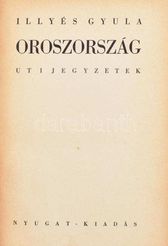 Illyés Gyula: Oroszország. Uti jegyzetek. Bp.,[1934],Nyugat, (Hungária-ny.), 221+2 p. Szövegközti fekete-fehér illusztrációval. Első kiadás. Kiadói kissé kopott egészvászon-kötés .