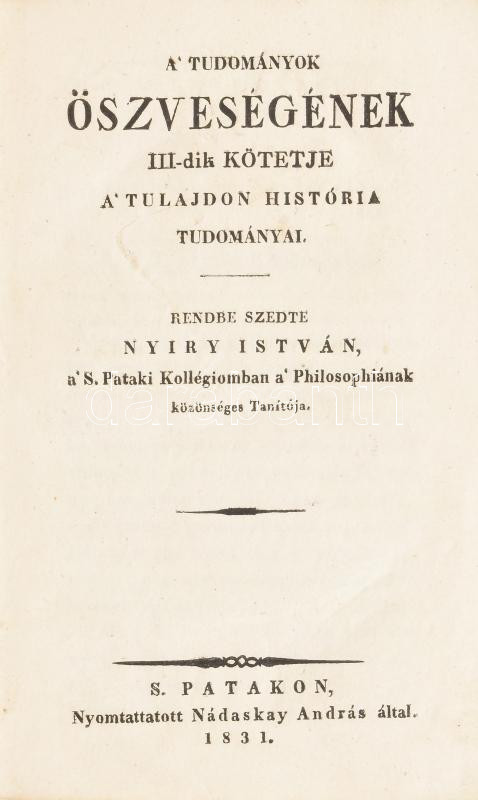 Nyiry István: A' tudományok öszveségének III-dik kötetje. A' tulajdon história tudományai. Rendbe szedte: Nyiry István, a' S. Pataki Kollégiomban a' Philosphiának közönséges Tanítója. S[áros]Patakon, 1831, Nádaskay András, 556+4 p. Átkötött kartonált papírkötés.