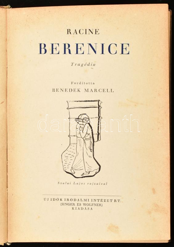 Racine, [Jean]: Berenice. Tragédia. Ford.: Benedek Marcell. Szalay Lajos rajzaival. Bp., [1943], Új Idők (Singer és Wolfner), 118+(1) p. Kiadói félvászon-kötés, kissé sérült borítóval, kijáró lappal, foltokkal.