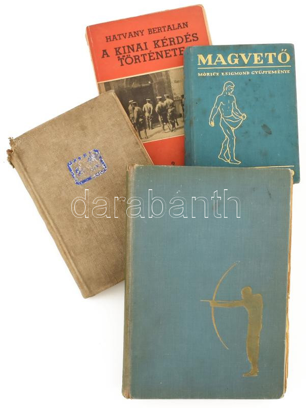 Vegyes könyvtétel, 4 db: Széchényi Zsigmond: Csui!...(1928. okt.-1929. ápr.) Bp.,1940, Dr. Vajna György és Bokor, (Athenaeum-ny.), 2+223+2 p.+39 t.(Fekete-fehér fotók.) Fekete-fehér fotókkal. Második kiadás. Térkép-melléklettel. Kiadói kopott egészvászon-kötés, egy tábla hiányzik, kijáró lapokkal és táblákkal, egy lap lyukas, egy lap sérült, kissé foltos lapokkal, a térkép kissé szakadt, megviselt állapotban.; Lázár János: Palesztina. DEDIKÁLT. Bp., én., Tabor, 180 p. Kiadói egészvászon-kötés, sérült borítóval, sérült gerinccel, hiányos, a hátsó szennylap és az utolsó két lap hiányzik, rossz állapotban.; Móricz Zsigmond: Magvető. A magyar irodalom élő könyve. Összegyűjt.: Móricz Zsigmond. Bp., 1940, Kelet Népe. Kiadói aranyozott egészvászon-kötés, kopott, foltos borítóval.; Hatvany Bertalan: A kínai kérdés története. Világesemények 2. Bp.,[1937.], Pantheon, 61+1 p. Két egészoldalas térképpel. Kiadói papírkötés,kissé kopott borítóval, a gerincen kis sérüléssel, ajándékozási sorokkal, névbejegyzéssel és névbélyegzéssel.;
