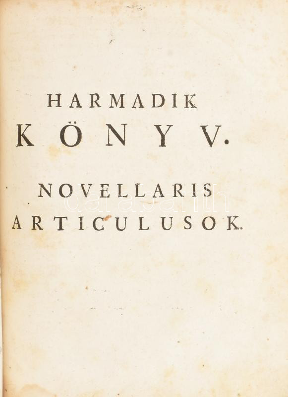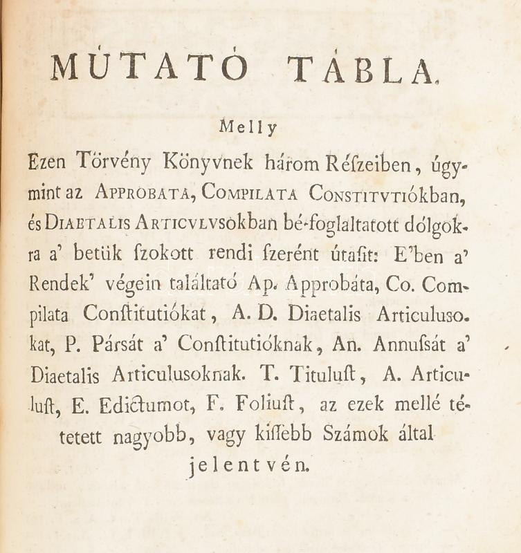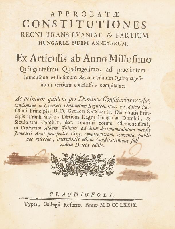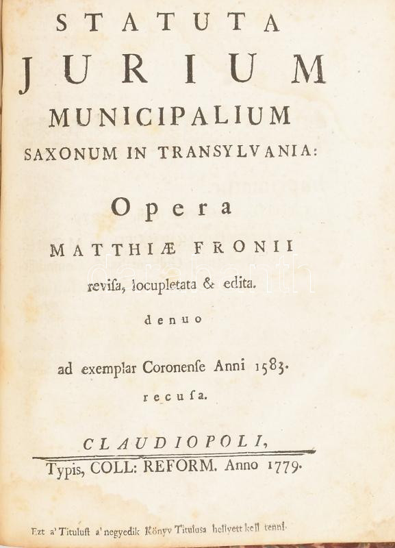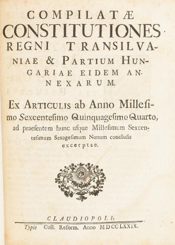 Erdély országának Három Könyvekre osztatott törvényes könyve. Melly approbata, compilata constitutiokbol és novellaris articulusokbol áll. Mostan újabban, minden haza-fiaknak hasznokra ki-botsáttatott. Első könyv. Approbata constitutiok. Approbatae constitutiones regni Transylvaniae & Patrium Hungaruae eidem annexarum. Claudiopoli, 1779. Typ. collegii reform.; Második könyv. Compilata Constitutiok. Compilatae Constitutiones Regni Transilvaniae & Partium Hungariae eidem annexarum. Claudiopoli, 1779., Typ. Collegii Reform.; Harmadik könyv. Novellaris Articulusok: Articuli Diaetales Principatus Transylvaniae Anni M. DCC. XLIV. Végén: Mutató Tábla. Melly Ezen Törvény Könyvnek három Részeiben, úgymint az Approbata, Compilata Constitutiókban, és Diaetalis Articulusokban bé-foglaltatott dolgokra a', betük szokott rendi szerént utasit: ...; Hozzákötve: Statua jurim municipalium saxonum in Transylvania: Opera Matthiae Fronii revisa, locupletata & edita, denuo ad exemplar Coronense anni 1583. recusa. Claudiopoli, 1779. Typ. collegii reform.; Kolos'váratt, 1779., A' Reformátum Collegium Betüivel, 4+3 sztl.+280+2 p.;3 sztl. lev.+118 p.;1 sztl. lev.+90 p.+31 sztl. lev.+14 sztl. lev.+61+3 p. Magyar és latin nyelven. Korabeli félbőr-kötésben, kopott borítóval, foltos lapokkal, a lapszéleken kézírásos bejegyzésekkel, az utolsó lap sarkán restaurálással.