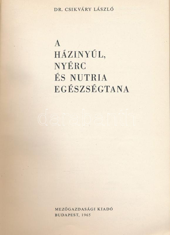 Csikváry László: A házinyúl, nyúl és nutria egészségtana. Bp. 1965., M... https://www.darabanth.com/hu/442-Gyorsarveres/442.0/Konyvek/Konyvek-Konyha-es-kert~1000014/Csikvary-Laszlo-A-hazinyul-nyul-es-nutria-egeszsegtana-Bp-1965-Mezogazdasagi-KiadC3~II2910108
