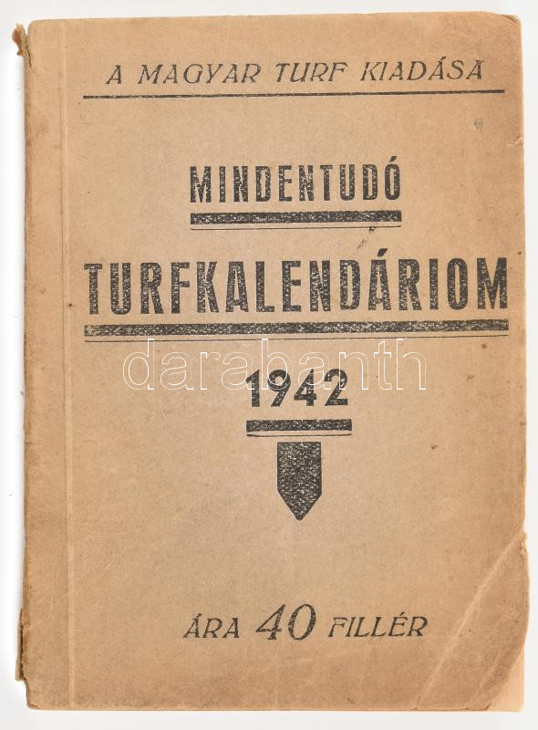 Mindentudó Turfkalendárium 1942. Bp., Magyar Turf. 160 p. Többek közt lósport versenynaptárral. Kiadói papírkötésben, sérült gerinccel és kissé sérült borítóval.