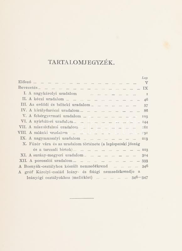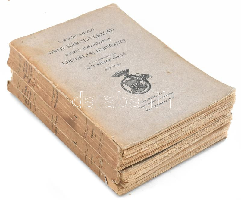 A nagy-károlyi gróf Károlyi család összes jószágainak birtoklási története. 1-2. köt. A család megbízásából kiadja gróf Károlyi László. Bp., 1911., Franklin, XXII+2345+1 p. + 1 (kihajtható tábla) t. ; 358 p. + 1 (kihajtható térkép) t. Kiadói papírkötés, kissé kopott, kissé foltos borítókkal, az I. kötet gerince elvált a borítótól, és a könyvtest szétvált, a II. kötet kötése szétvált és a gerinc sérült, a 2. kötetből a 2. kihajtható tábla hiányzik.