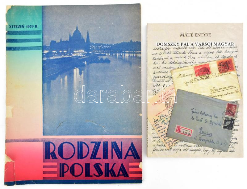 Máté Endre: Domszky Pál, a varsói magyar. Bp., 2013, szerzői kiadás. Kiadói papírkötés. A szerző által DEDIKÁLT példány. + 1939 Rodzina Polska c. lengyel nyelvű képes folyóirat egy száma, sérült címlappal. Benne Magyarországról szóló írásokkal, fotókkal (Budapest látképe, Horthy Miklós, stb.)