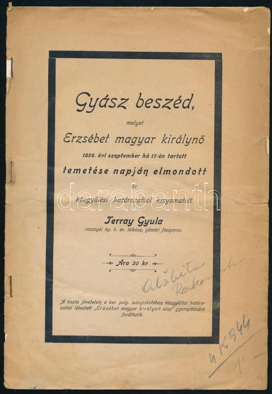 Terray Gyula: Gyász beszéd, melyet Erzsébet magyar királynő 1898. évi évi szeptember hó 17-én tartott temetése napján elmondott és közgyűlési határozatból kinyomtatott. Rozsnyó, 1898, "Sajó Vidék"-ny., 12 p. Borító nélküli példány, szakadozott lapokkal.