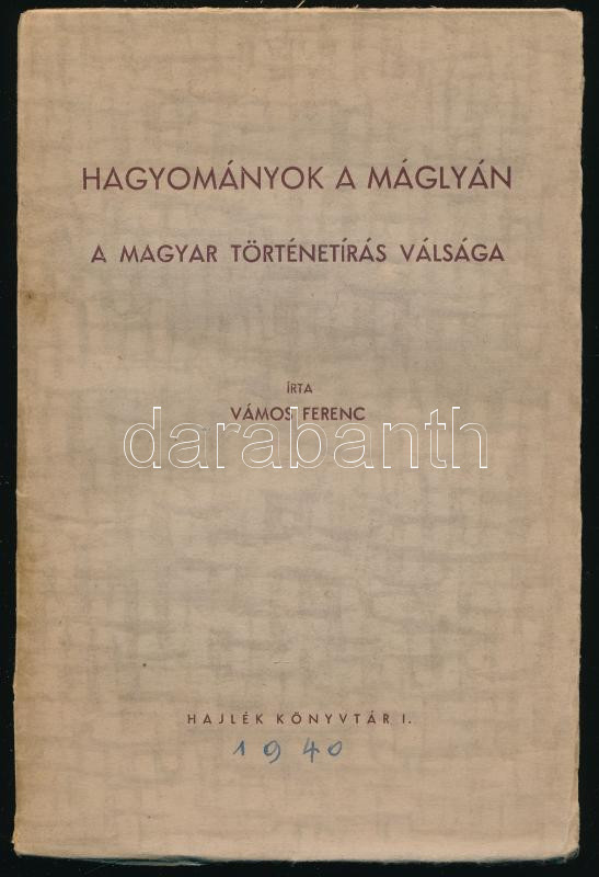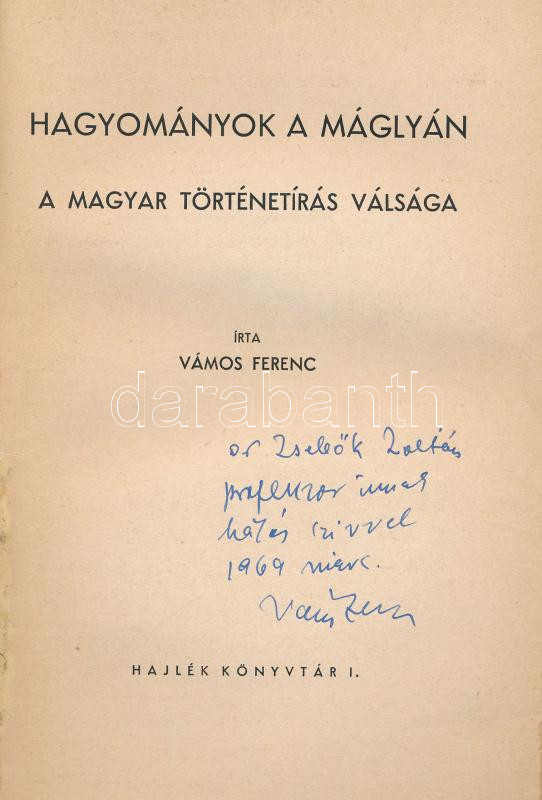 Vámos Ferenc: Hagyományok máglyán. A magyar történetírás válsága. DEDIKÁLT! Hajlék Könyvtár 1. Kecskemét,[1940], Első Kecskeméti Hírlapkiadó- és Nyomda Rt. Kiadói papírkötés, sérült, javított gerinccel.